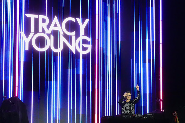 Eine LED-Wand zeigte Songtexte von Laupers Liedern, und nach kurzer Wartezeit begann bereits der Support Act, Tracy Young. Young ist DJ und Producerin und hat für einen Madonna-Remix schon einmal einen Grammy gewonnen. Hier führte sie nun ein DJ Set auf, das für uns, die wir mit DJs auf der Bühne nicht sonderlich vertraut sind, eher befremdlich wirkte. Immer wieder wurden die Refrains bekannter Songs - ganz am Anfang von "Girls Just Want To Have Fun" (in der schlimmen Remix-Version von 1994) später unter anderem von Eurythmics - angespielt und versanken dann in Boller-Rhythmen, während Young selbst offensichtlich viel Spaß hatte und die ganze Zeit strahlte, winkte und mit ihren Händen Herzen formte.
